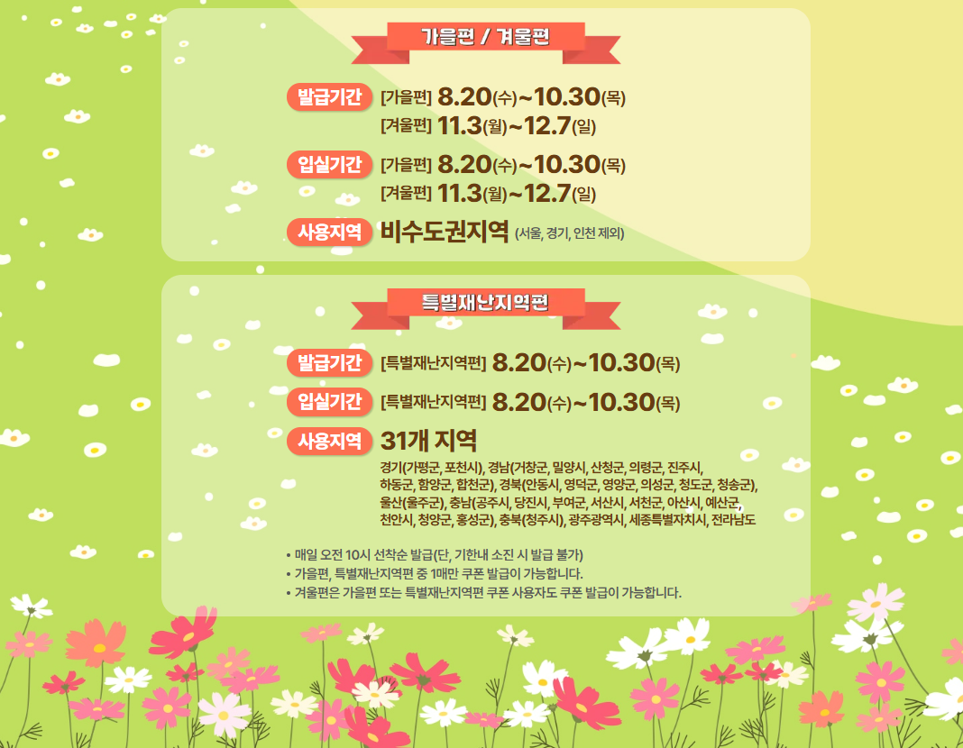 | 중복 발급 제한 | 가을편과 특별재난지역편은 중복 불가, 겨울편은 별도 발급 가능 |
