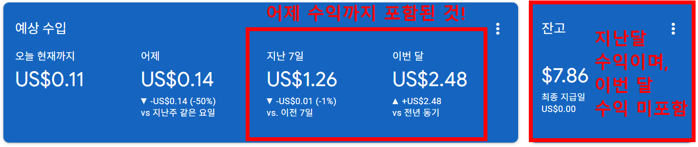 | 이번 달 (US$2.48) | 이번 달 1일부터 '어제'까지의 예상 수익 누적액입니다. | ❌ 포함 안 됨: '이번 달' 수익 역시 '오늘 발생 중인 실시간 수익'은 반영하지 않고, 어제까지의 누적 예상 수익을 보여줍니다. 오늘 발생한 예상 수익은 '오늘 현재까지' 항목에서 별도로 확인할 수 있습니다. |