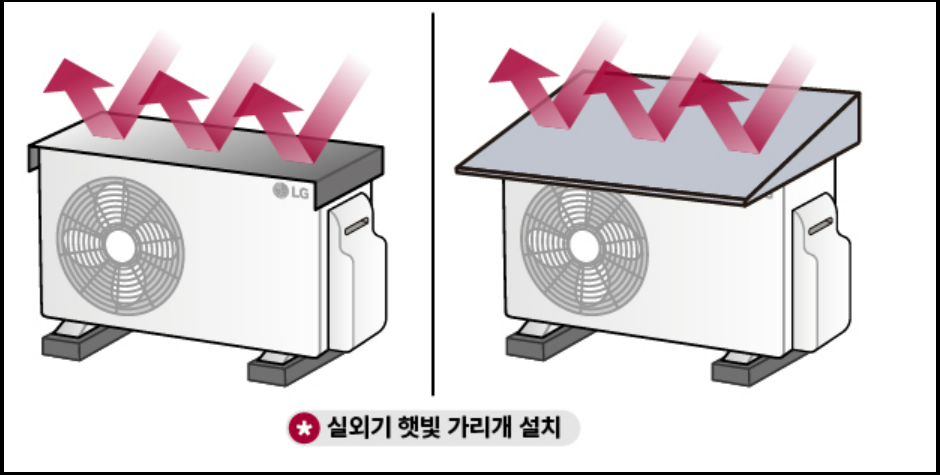 실외기에 햇빛 가리개를 설치해 주면 많은 도움이 됨 (단 후면과 측면은 가리지 않아야 함) - 에어컨 전원 리셋 (차단기 또는 플러그 분리 후 5분 대기)