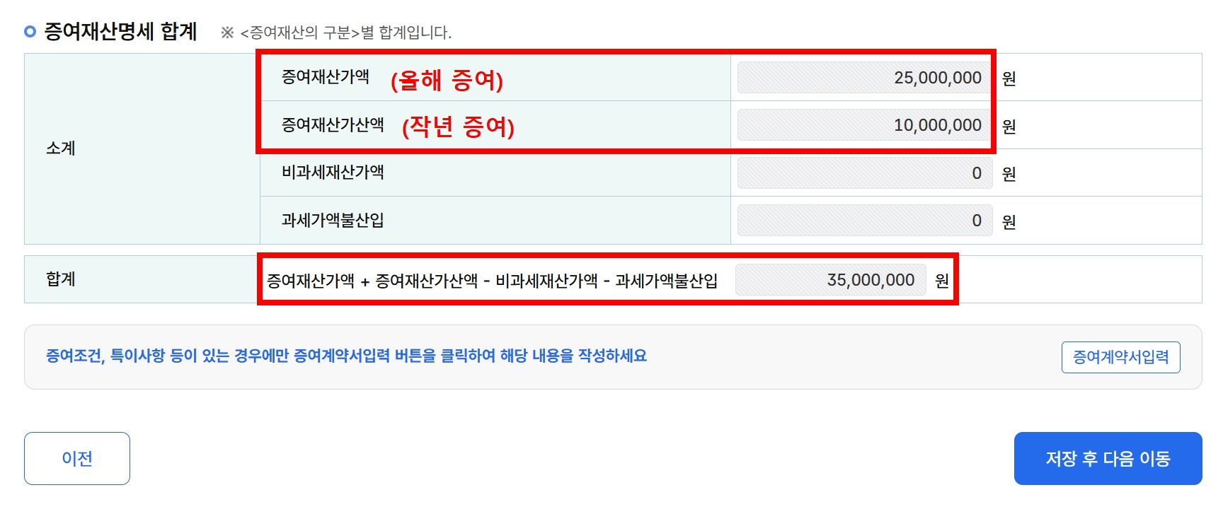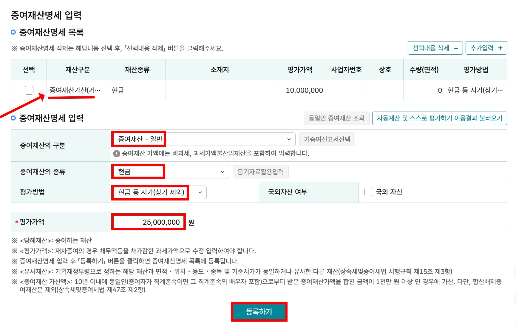 홈택스에 '증여재산명세 입력' 페이지에서는 증여재산가산액과 증여재산을 구분해서 입력을 해주어야 합니다.