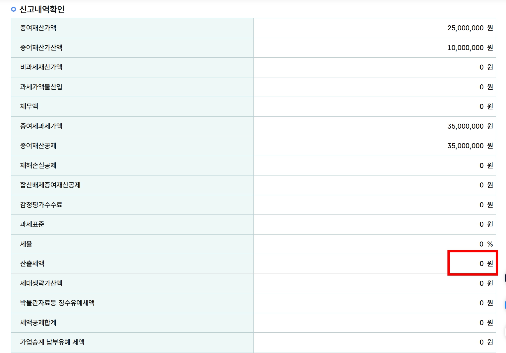 입력한 내역에 따라 홈택스가 자동으로 세액을 계산해 줍니다. 납부 기한 내에 인터넷 뱅킹이나 가상계좌 이체로 납부하면 신고 완료! (저는 비과세 한도 내의 증여라서 납부 세액이 없었습니다)