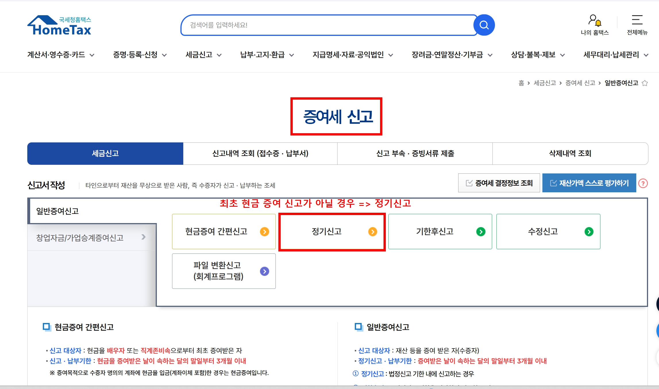 2) 정기신고 : 현금 증여가 최초가 아닐 경우는 정기 신고로 선택