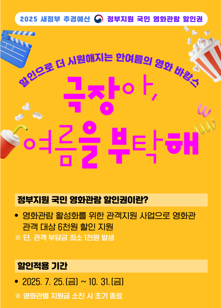 정부가 여름방학 및 휴가철에 맞춰 국민들의 문화 향유 기회를 넓히고 영화산업을 활성화하기 위해 제공하는 영화관람 지원 할인권입니다.