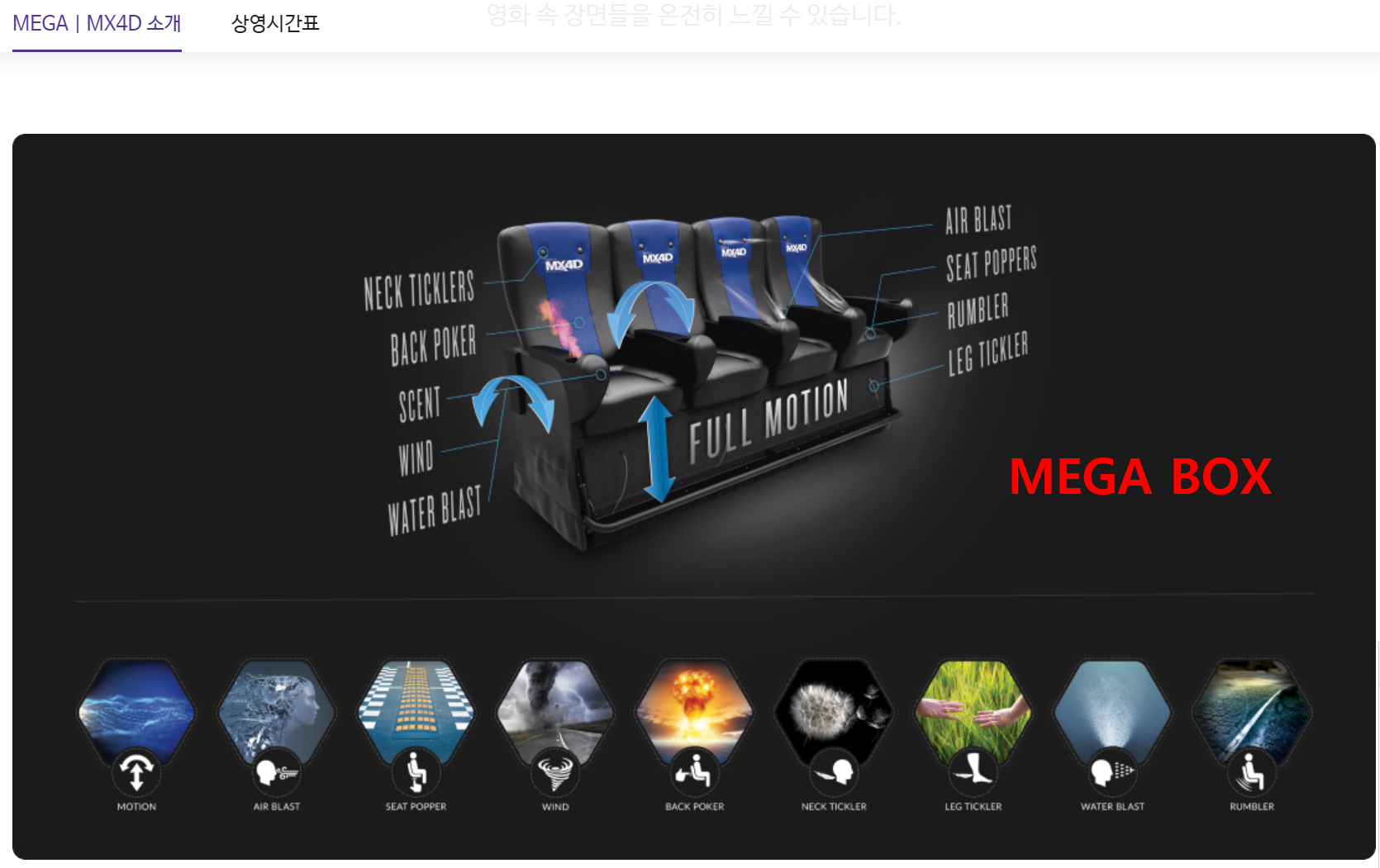 - 메가박스 MEGA | MX4D: 9가지 모션 + 비·안개·버블·섬광 등 6가지 환경 효과