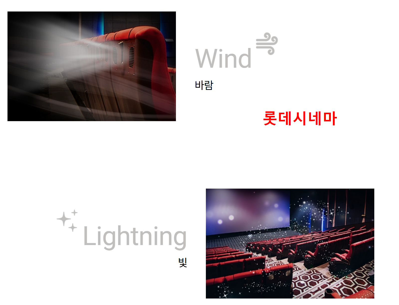 | MX4D | 미국식 4D, 좌석 동작과 함께 팔/등/다리 자극 기능 | 롯데시네마 건대입구, 수원, 중계 |
